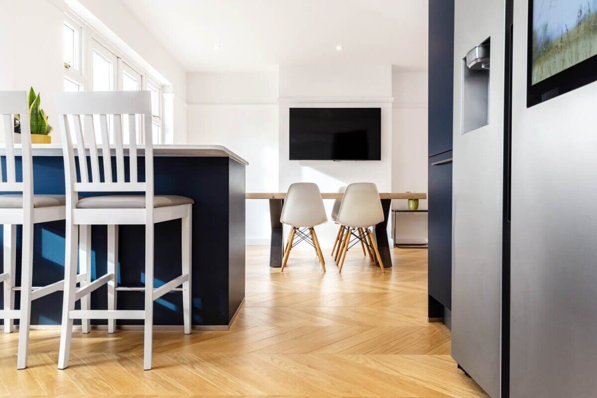 When two rooms became one, we introduced a prime-grade chevron floor measuring 90×500mm. After precisely levelling the subfloors with plywood, we fully bonded the chevron design to create a continuous flow through the expanded living and dining area.