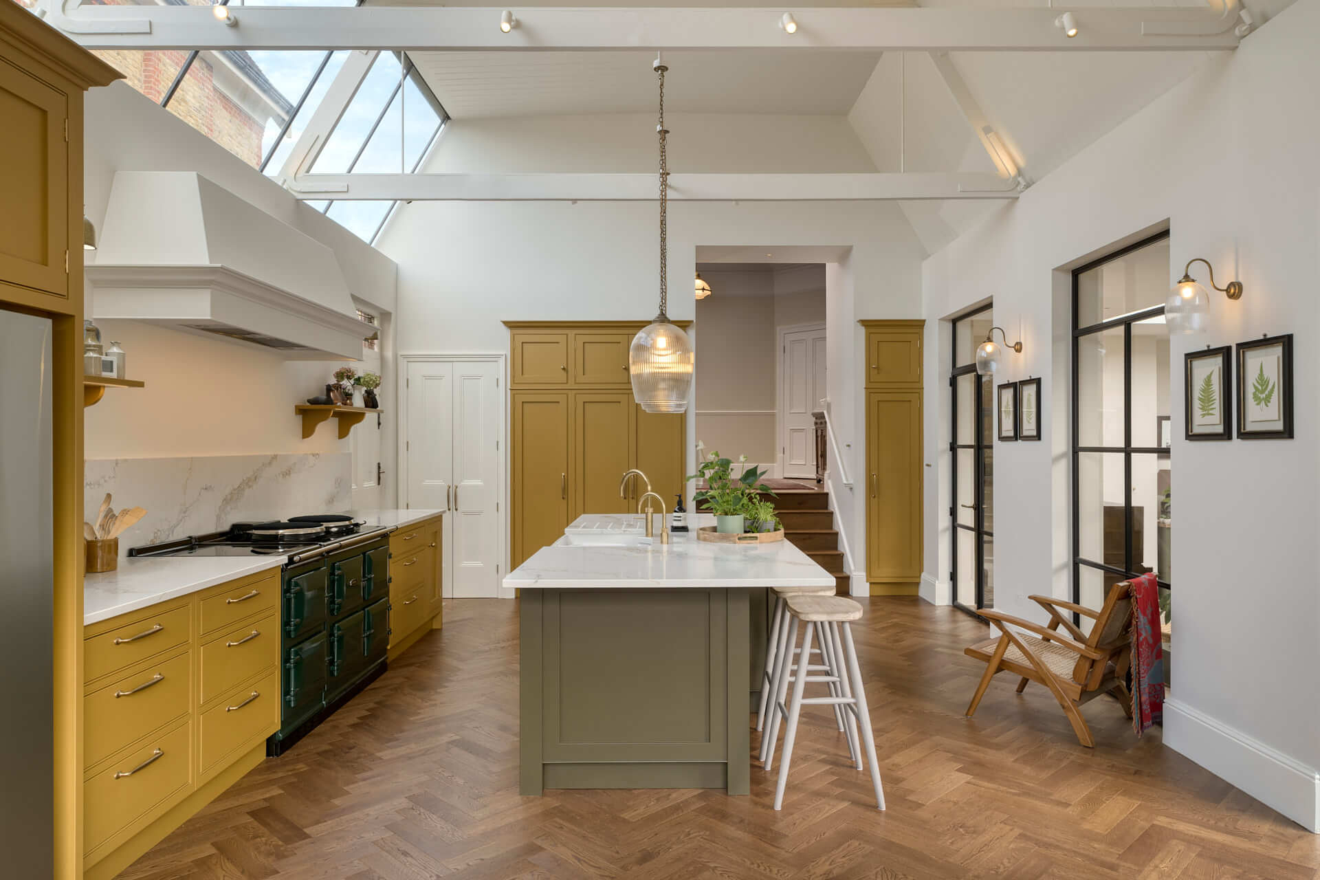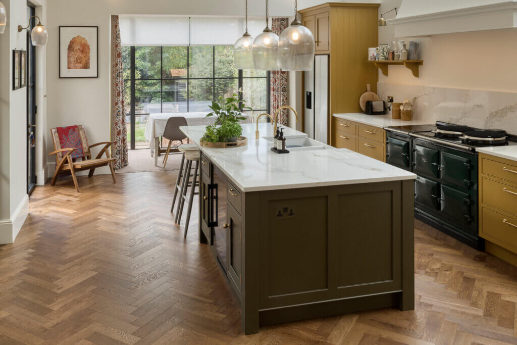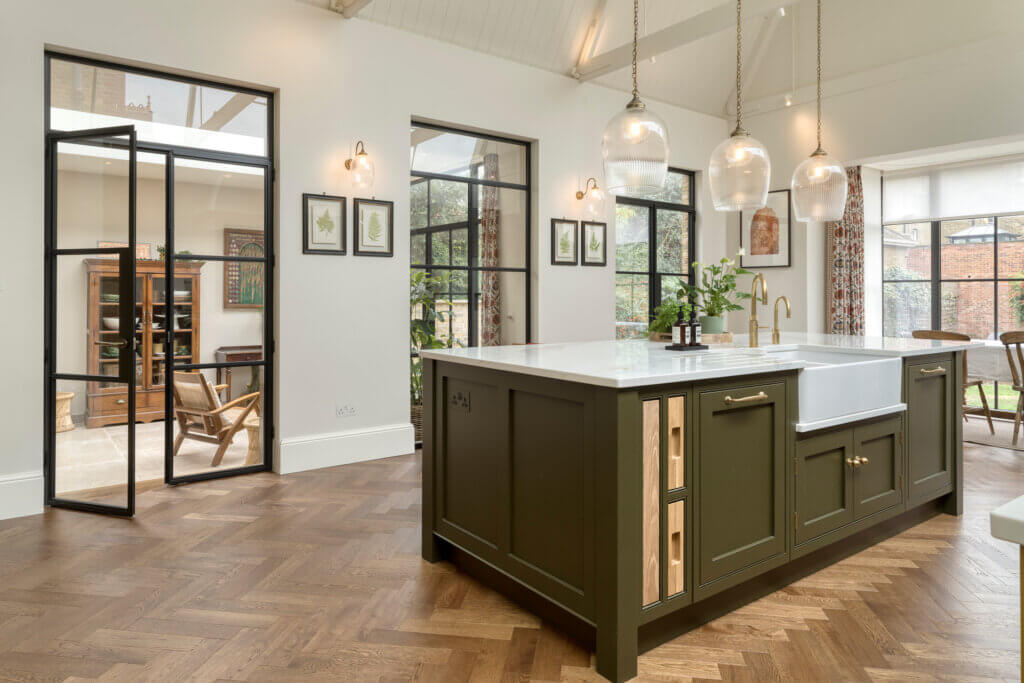 This kitchen brings together classic craftsmanship and a warm, familiar sense of home with herringbone engineered flooring. Natural light fills the room through steel-framed windows and a generous skylight, giving the space a calm, open feel. The herringbone oak floor sets a traditional foundation, while the painted cabinetry in deep green and mustard tones adds quiet character.