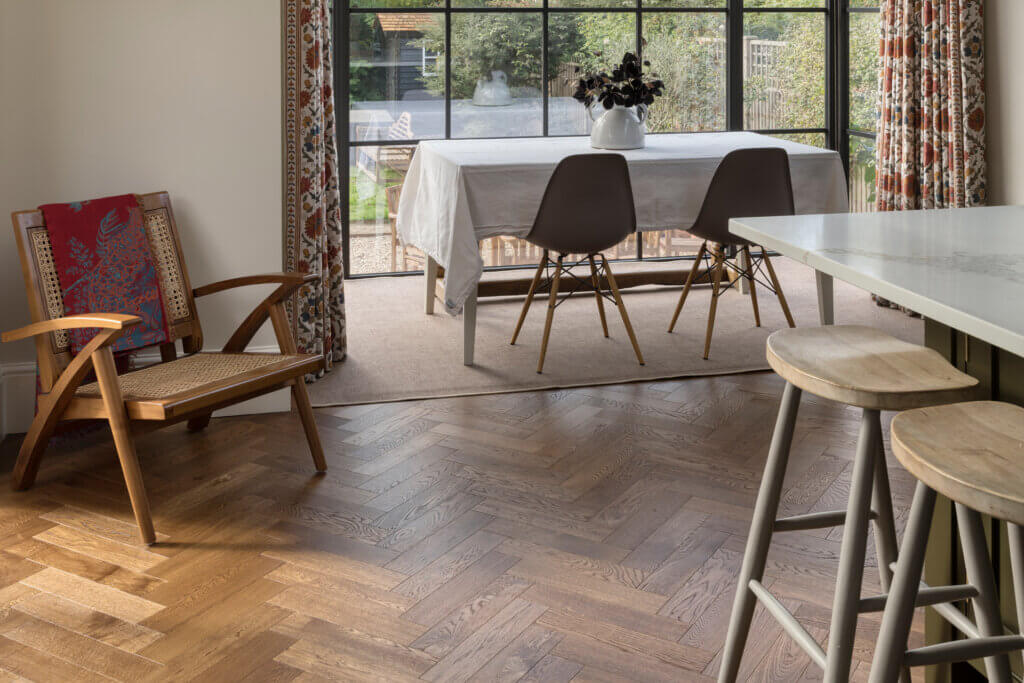 For this St Albans residence, the goal was a harmonious blend between flooring and existing walnut furniture. Our client selected Nutmeg, a premium oak-engineered parquet with a rich, walnut-inspired hue. Installed in a medium herringbone format (90x400mm), giving the floor a warm glow that complements existing décor